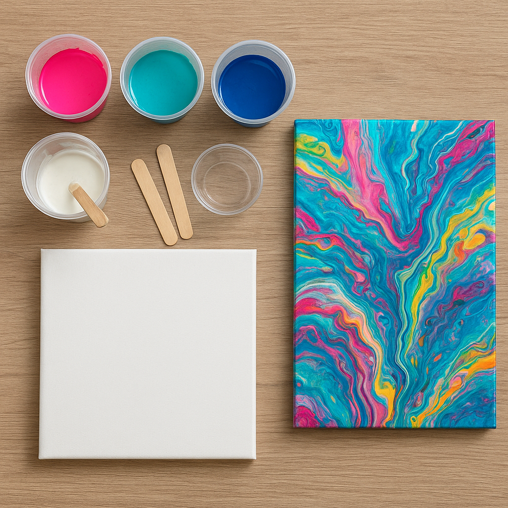 - Dirty pour – mieszanie kilku kolorów w jednym naczyniu przed wylaniem, co daje subtelne przejścia i fale;