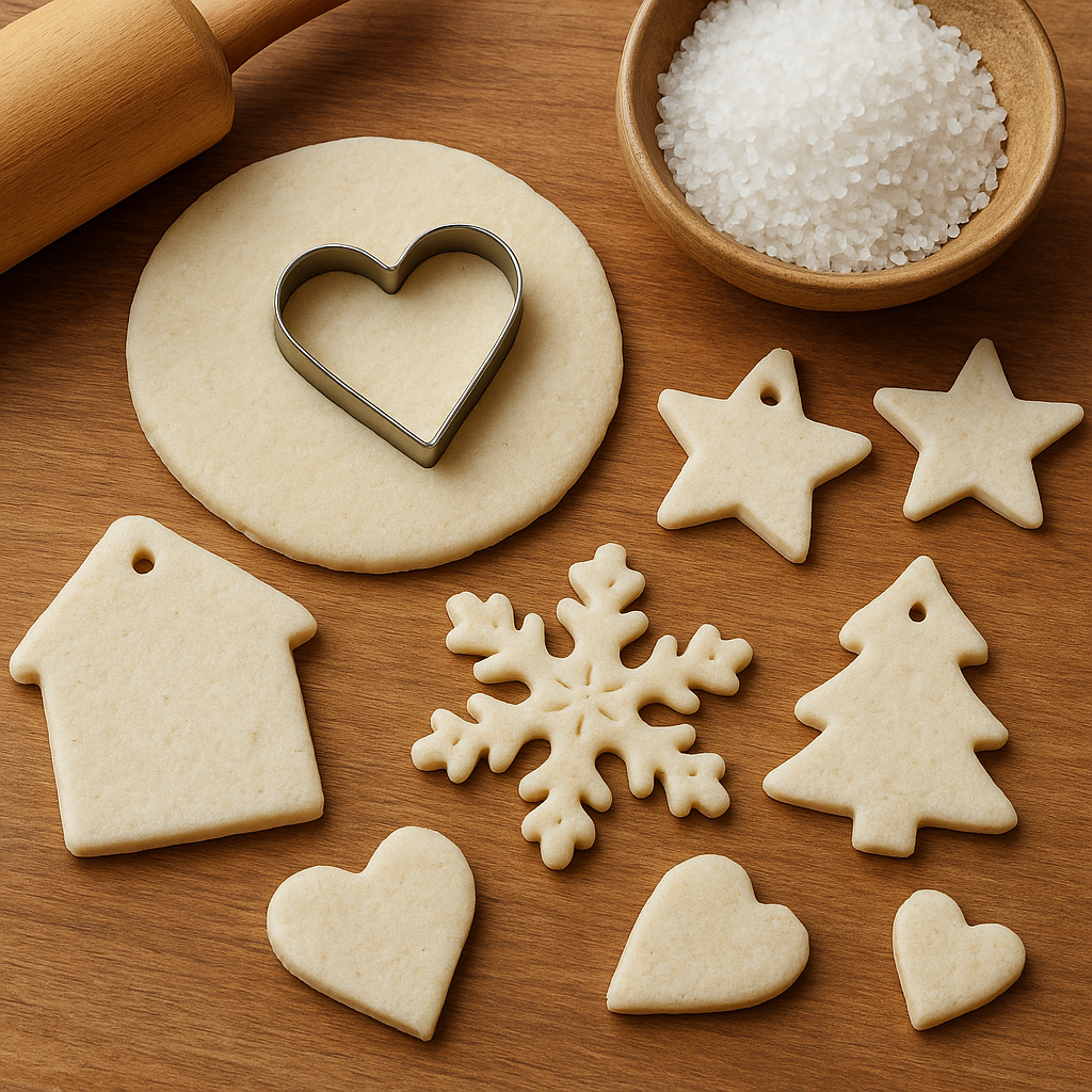 Po uzyskaniu jednolitej struktury rozwałkuj masę na grubość około 4–5 mm. Używając foremek do ciastek, wykrawaj różnorodne kształty: gwiazdki, serduszka, listki. Możesz także formować elementy ręcznie, np. małe zwierzątka czy geometryczne dekoracje. Do wycinania otworów umożliwiających zawieszenie warto użyć wykałaczki lub patyczka.